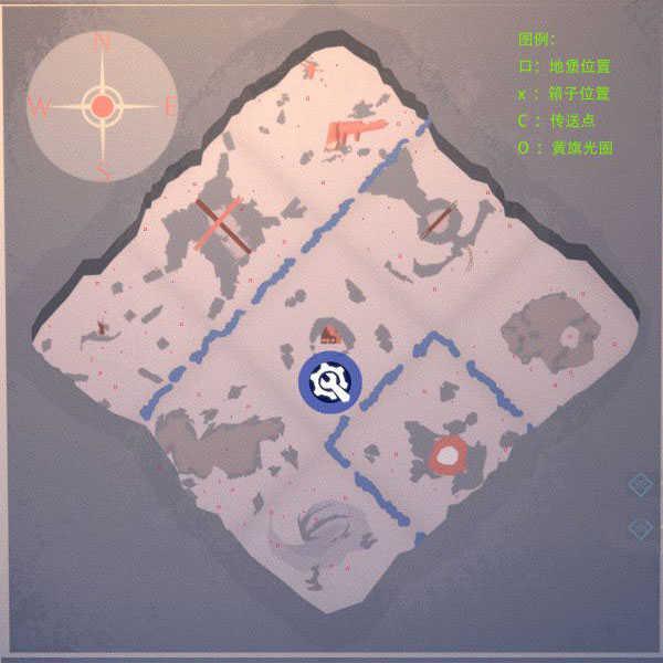 这张图是6张图中最穷的一张图,整个地图周边只有5个地方有地形,WN,NE和S都是只有一个地堡,没有任何箱子,在WN和NE炸桥点的附近还有三狼(WN三白狼,NE三黑狼),打野挖宝的时候一不留神就容易白给。