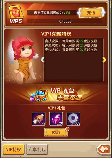 2、免费领取vip1到5级礼包,获取丰富vip特权。