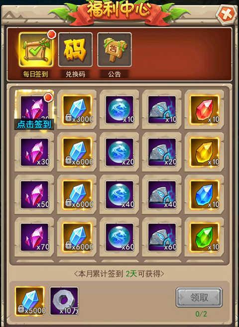 3、每日签到还能领取丰富资源,宝石、钻石、强化石等。