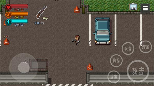 2、左下角是操作轮盘控制角色奔跑和行走的方向,右边则是攻击,以及物品栏装备栏,切换奔跑状态和确认键