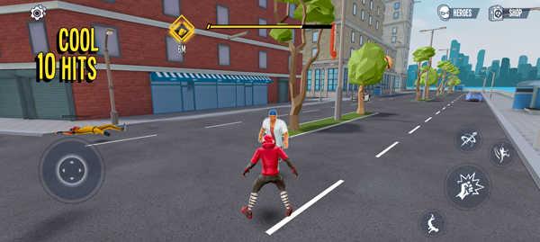 2、游戏的玩法很简单,只需在有限的生命值内击败游戏中的所有歹徒,左侧控制角色的方向,而右侧则是各种技能键;