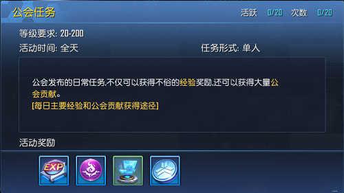 公会任务:加入公会的玩家可以在任务管理员处领取公会任务。公会任务每10个为一轮,每完成一个公会任务都会获得经验和公会贡献的奖励。每天最多可以完成20个公会任务,公会