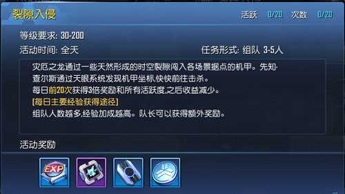 而通过任务和活动达到30级以后,就可以进行裂隙入侵的活动啦~裂隙入侵的活动需要至少3人以上的玩家组队进行活动,组队人数越多,经验获得也越多哦~每天最多完成60次,而前20次获得的奖励是3倍哦!所以前二十次的性价比是最高的,完成裂隙入侵也会有惊喜宝箱赠送。