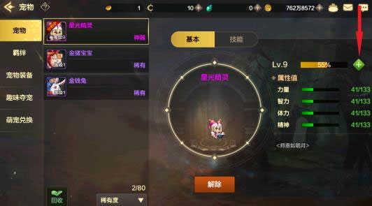 宠物可以给玩家提供额外的属性值(例如图中星光精灵可以给角色提供力量、智力、体力、精神),宠物升级后可以增加给角色提供的属性,提高力量、智力、体力、精神属性,但是每个宠物都有属性上限值(例如图中的宠物满级后只能提供133点力量、智力、体力、精神)。