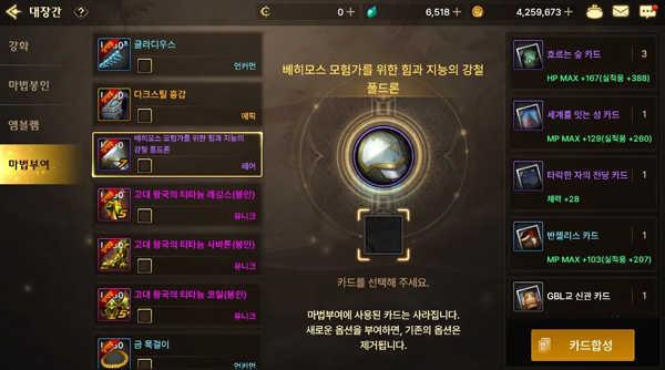 4、铁匠铺 最后可以进行 的声望增幅内容是 “附魔” 。您可以通过结界来增加声望能力,该结界可以通过合成各种怪物或地牢卡片来获得各种统计数据,这些怪物可以在地下城周围的过程中随机获得,但不像徽章那样会在拆除设备时返回。用来附魔的就不要回来了,把一开始用过的传下来的装备附魔感觉有点浪费。建议尽量保留稀有卡牌,以普通卡和非普通卡为重点进行附魔。