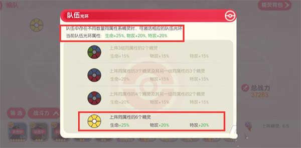 上阵同属性的6个精灵:生命+25%,物攻+20%,特攻+20%