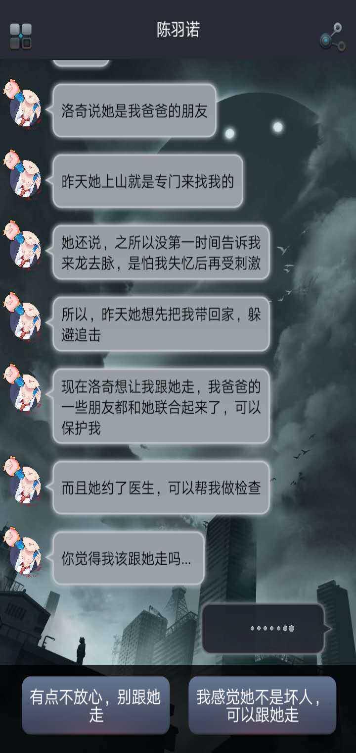 3、第二日第二篇中,在陈羽诺选择是否去医院时,选择“有点不放心,别跟他走”(选择第二个选项后,陈羽诺会在路上遭遇不幸。失去联络)