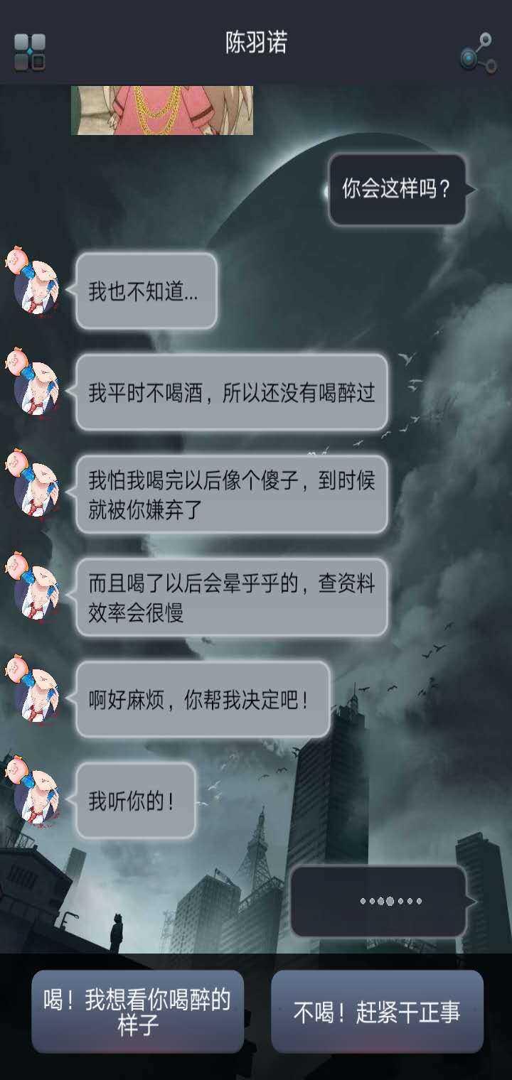 4、第四日第二篇中,在他的朋友劝酒时,选择“不喝”(如果选择了“喝!”陈羽诺就会表白哦!不过酒有问题,bad ending)
