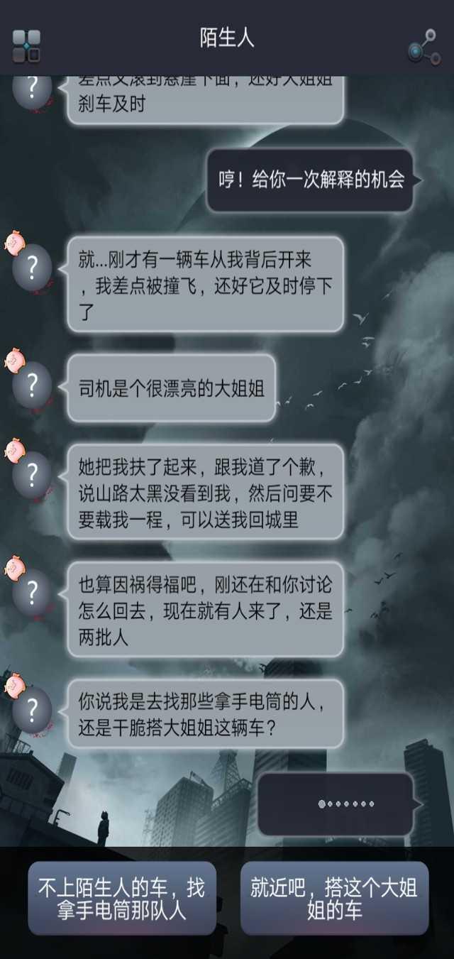 1、第一日第二篇中,在陈羽诺遇到“拿手电筒的那队人”和“大姐姐”时。选择“大姐姐”,(如果选择了“拿手电筒的那队人”,他就会开始立flag(图二),最后bad ending)。