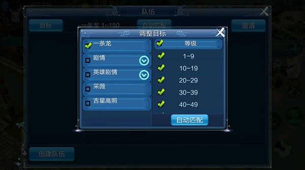 3、想组队做任务却没有认识的小伙伴?游戏中有强大的自动匹配功能,打开组队面板,在“目标”选择要参加的活动,就能一键组队!