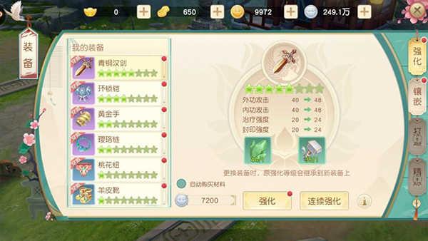 玩家在游戏界面中可以在右下角点击装备按钮,然后可以对装备进行强化或是连续强化,而消耗的材料为低级玄铁和铁锤,星等越高,需要消耗的材料也就越多。而装备的星等越高,相应的属性加成也就越高,赋予玩家的战斗力也就越高。