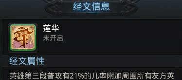 注解 :莲华经文的效果,类似于罗睺经文,如果对它不怎么理解的话,你可以把他当成另一个罗睺经文,他和罗睺经文的效果相差不多。罗睺经文是释放技能后,下一次普攻附带自身物理强度+ 法术强度之和 16.5% 的法术伤害。而莲华经文,是第三段普攻 21% 几率附加周围所有友方英雄物理和法术强度之和 0.5% 的伤害。