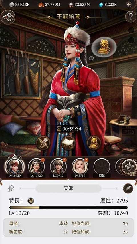 作为一款养成模式游戏,有了美人,当然少不了子嗣培养,玩家可通过与妃子交合后,诞下自己的子嗣。可通过活动及道具进行培养,让子嗣们快速成长,从而挑选出合适自己的继承人,还可对子嗣进行提亲、联姻等等操作。