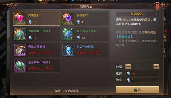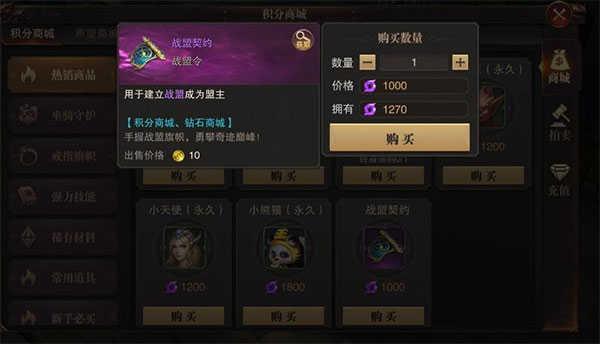 玩家只需要花费1000积分,即可从积分商城买到战盟契约,使用战盟契约可创建战盟。当然玩家也可以选择不自己创建战盟,直接加入他人已建立好的战盟。目前,退出战盟是没有冷却时间的,也就是说可以随时更换战盟。