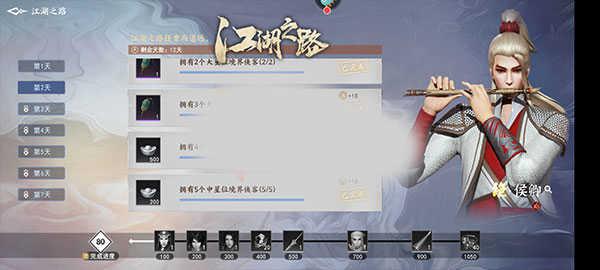 【江湖之路】:这个玩法为限时活动,大家需要在对应的时间里面完成任务,部分任务可以拿到大量的银锭,当然角色碎片以及装备也有很多。而且完成任务的数量达到对应要求,还可以领取额外奖励,例如达到800活跃度可以获得绝品角色侯卿。