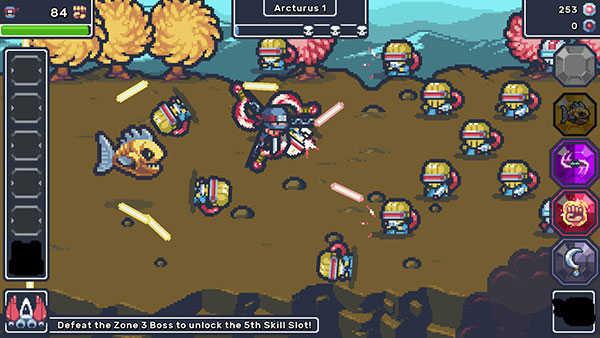 2、根据指引,解锁游戏装备,并击败迎面而来的敌人。