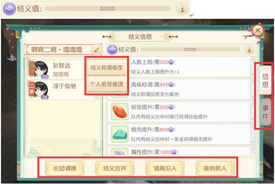 5、小伙伴们在结义后如果想发起“长幼调换、结义合并、请离旧人、接纳新人、介意称谓修改、个人名号修改“操作,均可在结义信息界面点击右侧的”信息和事件“按钮查看和操作。
