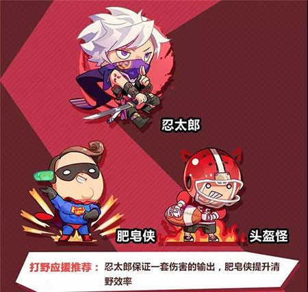 打野应援推荐:团长忍太郎保证一套伤害的输出,副团长头盔怪提供护盾,肥皂侠提升清野效率。团员方面,仍旧推荐选择风车妹、电锯男、持弓汪,堆出一定的物穿,并尽可能依靠技能打出伤害,来保证前期输出。
