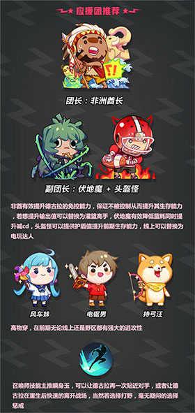上单应援推荐:非酋避免控制能有效保证防gank能力,副团长头盔怪提供护盾,配合上电玩达人的回血,能有效提升赖线能力。团员方面,以物穿为主,选择风车妹、电锯男、持弓汪来保证前期伤害能力。