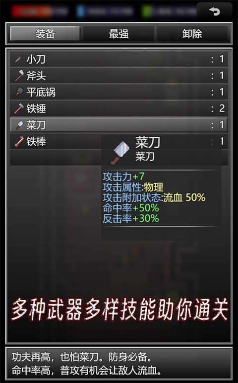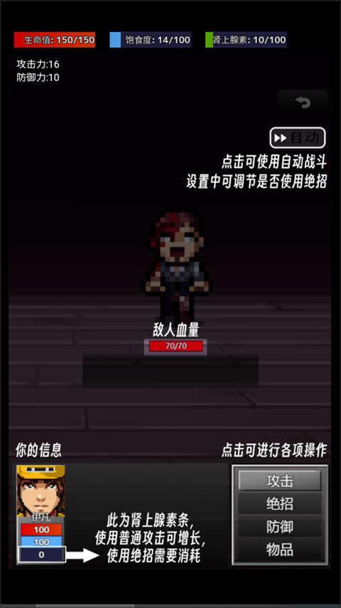 5、关于15级boss:是2180血,建议带狗入队、主角带齐装备并准备好一些医疗包和肾上腺素后去打。主角装备建议斧头(优良)、加闪避的衣服、运动鞋(优良)、钻石或水晶戒指,这些都可以在神秘人处购买。如果15级左右就去打需要一定操作,开打前把肾上腺素加满,建议准备五六个医疗包,打的时候主角一直猛击,boss眩晕时普攻,主角和狗血量掉到100以下即建议使用医疗包。如不希望繁琐操作可先刷级,刷到25级可以直接开自动打过去。