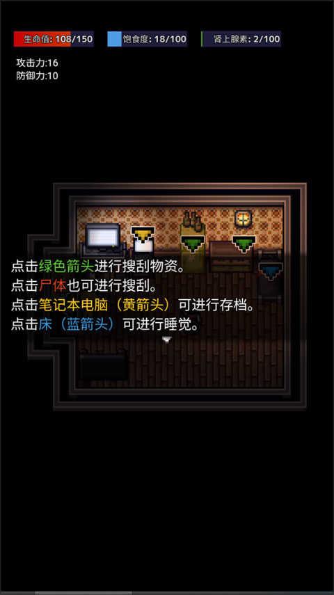 6、黄色箭头可以进行存档,绿色箭头进行搜刮物资,蓝色箭头进行睡觉补充饱食度,并且尸体也能进行搜刮。