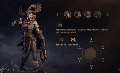 狂鹿是一个狂战士型的女性,她强势的地方在于收割能力,被动技能可以察觉周围生命值低于40%的敌人,因此如果你残血的话不要试图躲在草丛里,而是躲的远远的因为一旦被她察觉到开启主动技能后会增加20%的移速和伤害,根本跑不了。
