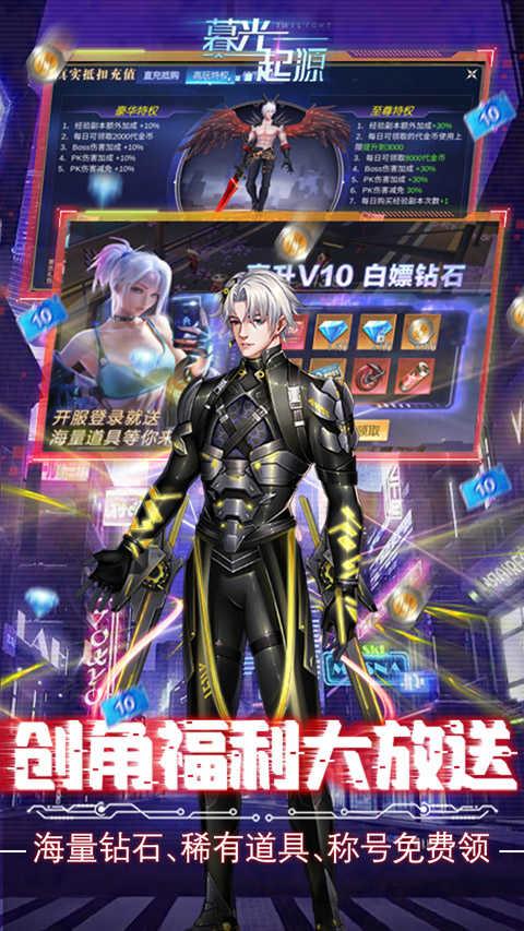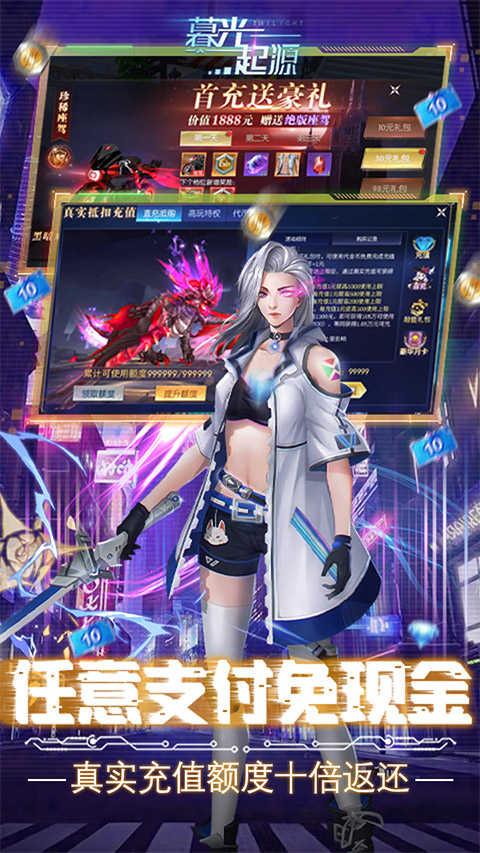《暮光起源》是一款都市题材的赛博朋克构建的大世界,特色各异的三大种族之间的竞争与互助;汇集了‘机甲、末世、异能’等方面的ARPG手游,令人震撼的视觉打击感,配合着6大神器打出的战斗特效;华丽的坐骑配合炫酷的翅膀,让你在这个异世界中做最靓的仔。