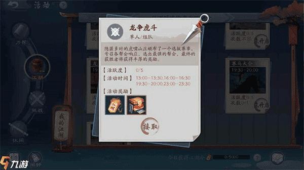 龙争虎斗活动可以获得大量的江湖令牌,但是只有在每天特定的时候才能进入,在11.30、14、30、17.30、20.30、22.30、24.30,每次都能持续半个小时。具体的进入方法是打开活动界面,接取“龙争虎斗”,然后就能传送到副本参加活动啦。在大厅中四个入口都能进入第一层,但是选择同样有时间限制,30秒内未选择会被请出大厅。