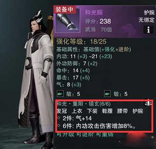 看图中红框,穿齐红框内的6件装备就能激活套装属性:内功伤害增加8%。所以,副本装搭配思路就是按套装需要去凑齐:发冠、上衣、下装、鞋子、腰带和护腕这六件就可以了。