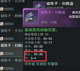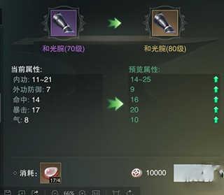 这是一件70级的副本爆的紫色护腕,萌新们不要奇怪我为什么放了一张70紫装。别着急在看一张图,当我们点一下这个装备上的升级按钮就会出现这张图片: