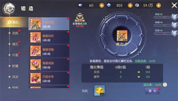 2、接下来是装备,除了通过打boss和活动获得高品装备后,还能够在锻造中进行各种强化。首先是提升强化等级。需要消耗星辰碎片,在光明寻礼、凛冬堡垒、限购商城等途径就能获得,强化等级提高后基础属性会大幅增加。在进行强化的时候尽量选择雨露均沾的模式,这样可以触发强化大师的属性加成。