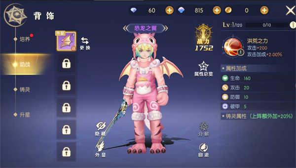 6、最后是外观、背饰等其他方面,这些方面因为比较氪金,所以平民玩家可以不过多追求,但是在土豪玩家眼中却是提升战力很重要的方式。背饰可以通过不断地激活来获得属性加成。外观分为坐骑,时装,头饰,只要获得对应时装就能解锁相应属性,即使不穿戴也同样能享受到加成。