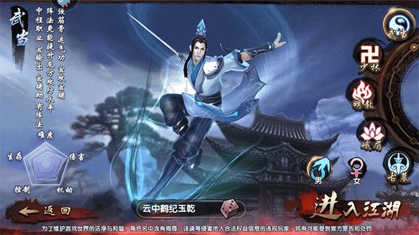 武当内力雄厚,有“内家武学之宗”的称号。武学强调内功修炼,讲究以静制动,以柔克刚,不主进攻,但亦不可轻易侵犯。秉承太极之精髓,以沉重的玄铁剑为兵器,在雄厚的内力支撑下,亦可将重剑用的得心应手、灵活多变。精通太极拳法、八卦阵法,阵法可大范围提高攻击力和防御力,而远距离御剑术则可快速突进,使其在团战中拥有很强控制能力。