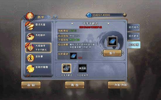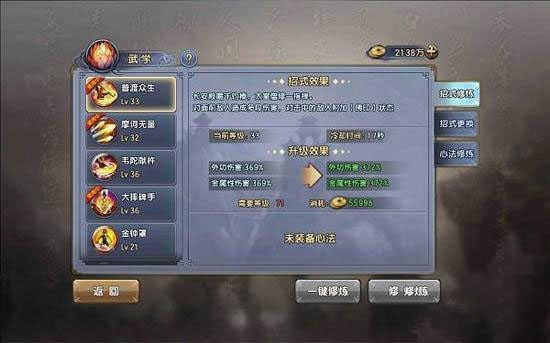 武学系统分为三个版块,分别是招式修炼、招式更换和心法修炼。