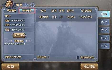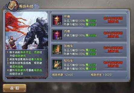 帮会升级是需要帮主及副帮主处理的帮会事务,升级需要消耗一定数量的帮会经验、资金及资源方可成功升级帮会等级
