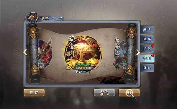 铜币副本,又叫“藏金阁”副本,是游戏中获得铜币的主要来源之一,重要性毋容置疑。每位玩家每天可进入2次,是的你没看错,只有2次,就算你是VIP玩家都不能多进1次!这样也从根本上拉近了平民玩家和土豪们的差距,真的国产良心啊!