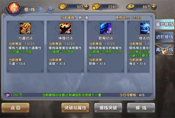修炼分为三类(基础修炼、进阶修炼、高阶修炼),在每类修炼中都飞卫若干个小功法,当这些小功法修炼达到顶级后可通过突破获得更高属性增益,同时开放小功法的更高等级。三类修炼也可通过突破逐步开启。