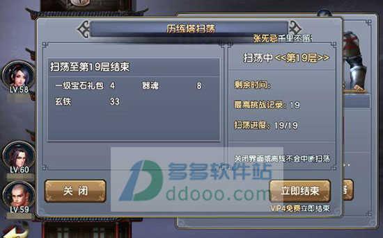 另外,历练塔每天是可以重置1次的哦!当少侠难以挑战下一关的时候,不妨重置历练塔,从头再来!而且游戏为少侠精心设计了扫荡功能,挑战成功的关卡,无需再进入战斗场景。只需轻点“扫荡”按钮,即可自动挑战!不过扫荡需要一定的时间,还好关闭界面或者离线都不会中断扫荡,因此趁这个时间,少侠完全可以去打打副本运个镖,一举两得!当然,如果少侠达到了VIP4,就可以免费立即结束扫荡,获得奖励。