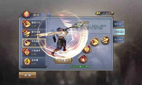 玩家可以同时修炼若干种招式,但是同时上阵使用的只有4个,如果需要更换招式,则要在招式更换中选择更换。为了让玩家更直观的感受到招式效果,玩家可以先通过招式演示来观看招式的释放和技能效果。选定某一技能后,再点击屏幕右侧的技能槽即可替换当前技能,非常的方便。