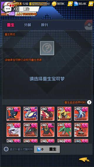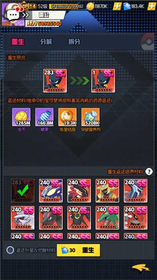 2、然后就可以看到返还材料,点击重生就可以啦!(继承中的宝可梦将按照真实消耗的资源返还哦~不同品质的宝可梦所需消耗的钻石也不同)