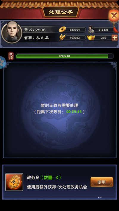 5、当玩家处理好公务后,此时需要等半个小时才能再次处理下一批公务。当然玩家如果有政务令,使用之后就可以额外获得一次处理政务的机会。