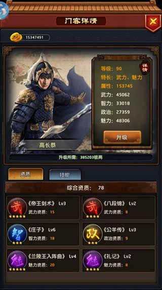 在这里我要安利一下只需六元钱就可以得到的高长恭,这帅哥不但颜值高,武力值也很高,是大家升级打怪的好帮手。获得门客后,你需要用金钱来为他们升级,所以这游戏里钱和兵力也是永远都不嫌多的。门客的属性会加成到玩家身上,所以说他们是你的分身也不为过。请注意,提高门客属性是提高你的势力值的最重要手段。