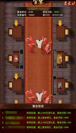 2、参加宴会需要交付元宝礼金,交多少元宝,可以获得和元宝相等的积分(积分用来兑换资源)每日限赴宴三次。