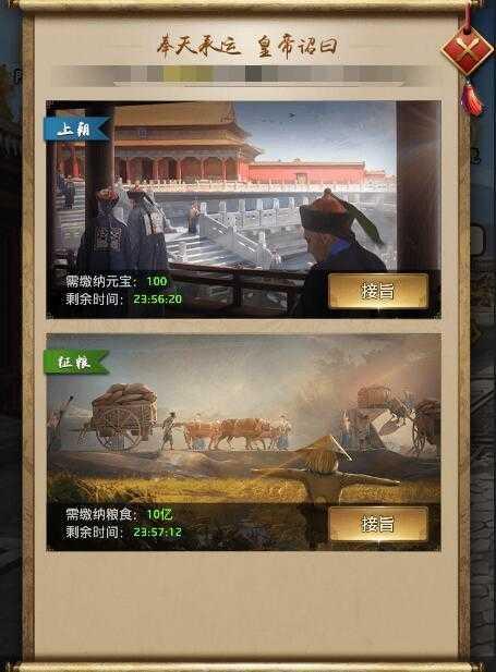 2、点击后会有相应纳贡要求的圣旨提示,纳贡有四种要求(银两纳贡,粮食纳贡,士兵纳贡,元宝纳贡)