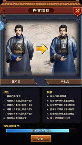 提升官品:随着玩家官品的提升,也会获得相应的门客奖励,官阶越高,所获得的门客资质也就越好。