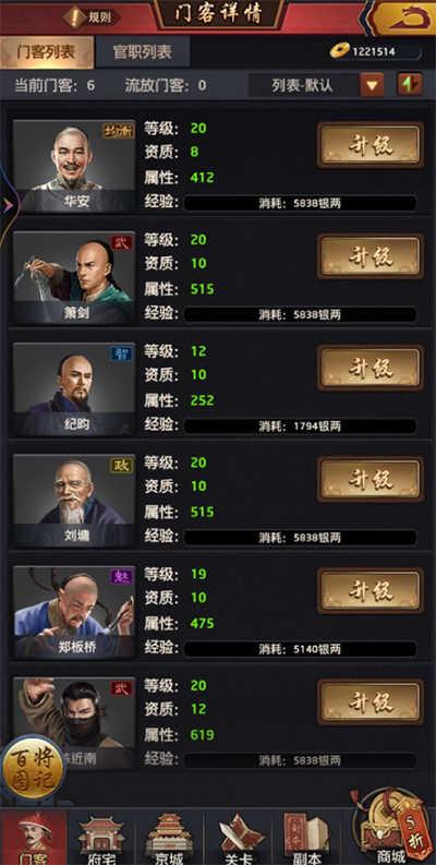 每个门客等级可以分为三大项——人物等级、书籍等级、技能等级。人物等级提高后四项属性会增加,并且人物升到60级才可以去衙门PK。