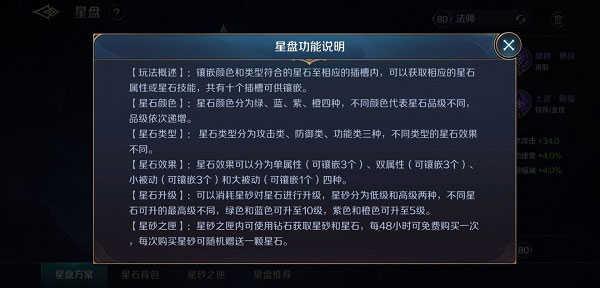 上图是星盘功能的主界面,可在此界面点击星石进行替换和升级操作,右方显示蓝色和绿色星石的属性总和,而紫色和蓝色星石需要点击星石查看属性。