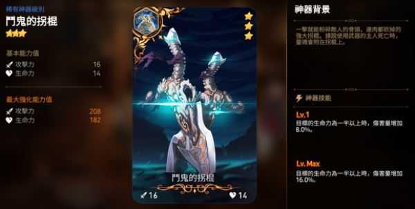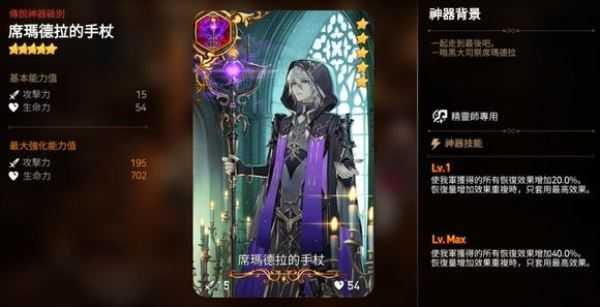神器简介:以及当自身受到致命伤害时,会赋予除自身之外的全体我军随机强化效果的魔导士专用神器