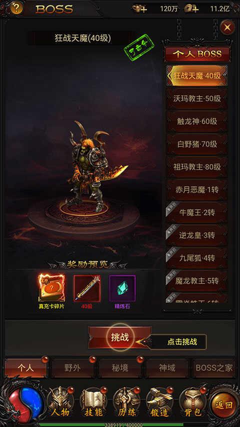 达到对应等级可解锁个人BOSS,个人BOSS可掉落对应等级的各品质装备,还有几率掉落红装和红装碎片,个人BOSS挑战次数每天0点重置。