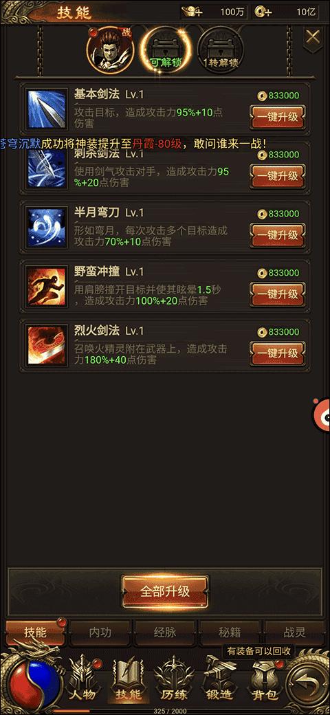 包含人物技能、内功、经脉、秘籍及战灵等多维玩法。